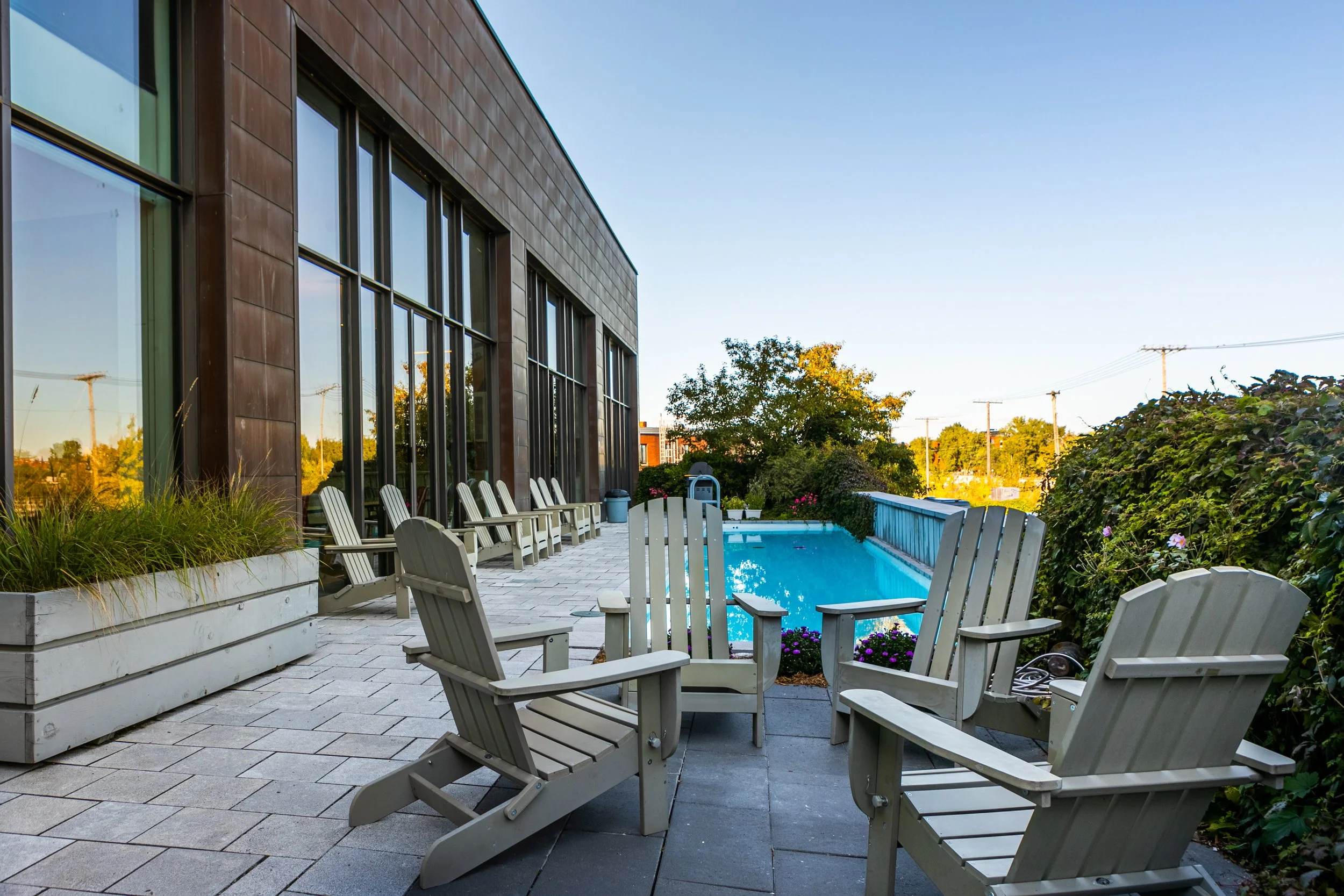 Aux Entrepôts Dominion, nous avons décidé d’aller encore plus loin pour offrir à aux locataires de nos bureaux et aux utilisateurs de notre espace de coworking des espaces de détente hors du commun : la salle d’entraînement permet aux utilisateurs de faire du sport sur place, et notre belle terrasse végétalisée avec piscine permet de décrocher complètement du rythme effréné de la journée de travail. Chaque étage comporte aussi des aires communes où il est possible de s’asseoir pour discuter ou relaxer loin de son bureau.